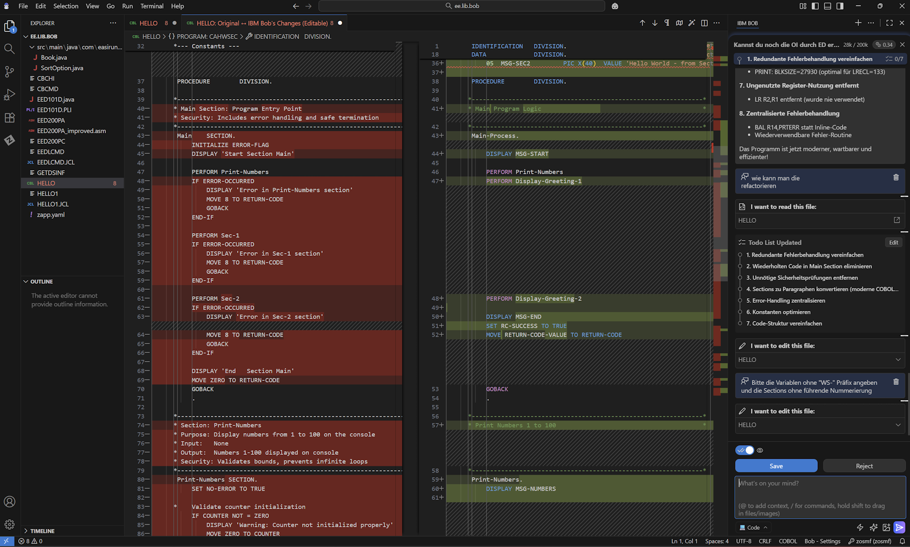 Screenshot Nutzeroberfläche IBM Project Bob beim Test mit COBOL