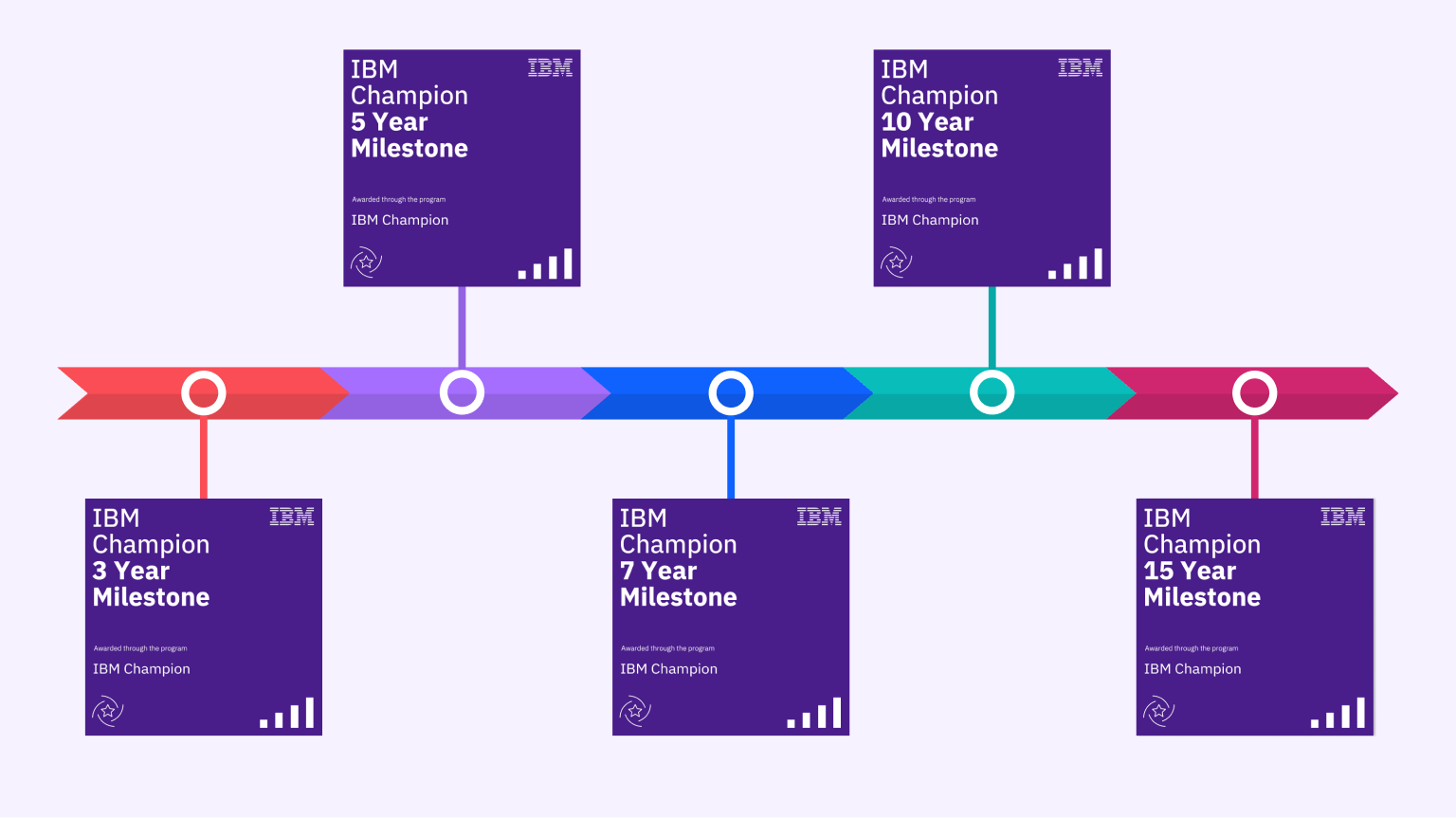 IBM Champions Program – Darstellung der Digital Badge Milestones (3, 5, 7, 10, 15 Jahre) – Quelle: IBM, IBM Champions program overview & benefits